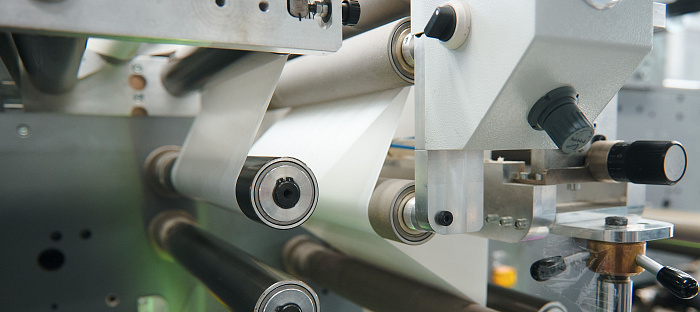 Для осуществления печати на клеевом слое используют специальное устройство «делам-релам», которое разъединяет самоклеящийся материал на две части: лицевой материал и подложку. Проводящие валы и устройство «переворота полотна» переворачивают лицевой материал клеевым слоем вверх и проводят через одну либо несколько печатных секций. После этого лицевой слой обратно переворачивается клеевым слоем вниз и соединяется с подложкой.